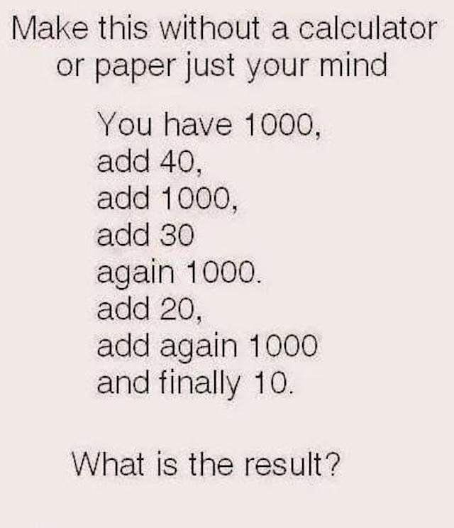 Another common reason for the mistake is the rhythm of adding round numbers like 1000 and 100. People tend to speed up, which leads to overestimation. But as you’ll soon see, the correct answer is not 5000.