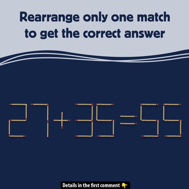 The equation 27 + 35 = 55 doesn’t quite add up, does it? Your task is simple: Rearrange only one matchstick to make the equation correct.