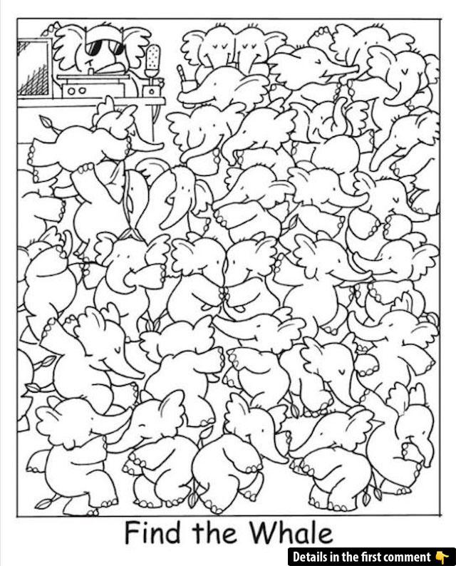 It’s easy to get distracted by all the elephants in the image. A common mistake people make is focusing only on the obvious animals and missing subtle details. As we’re conditioned to look for animals with similar features, it becomes harder to pick out the differences in color and shape that the whale has compared to the elephants. But don’t worry, you’ve got this!