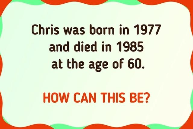 Here’s the puzzle: “Chris was born in 1977 and died in 1985 at the age of 60. How can this be?”