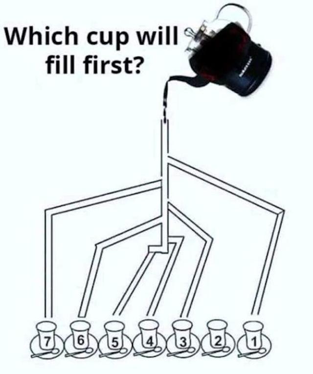 Have you ever encountered a puzzle that tests both your observation skills and your ability to think logically? Well, here’s a brain teaser that will challenge you! In the image, a pot of coffee is pouring into a complex set of pipes connected to several cups. The task is simple yet tricky: Which cup will fill first? Take a closer look and try to figure it out without overthinking. Can you solve it?